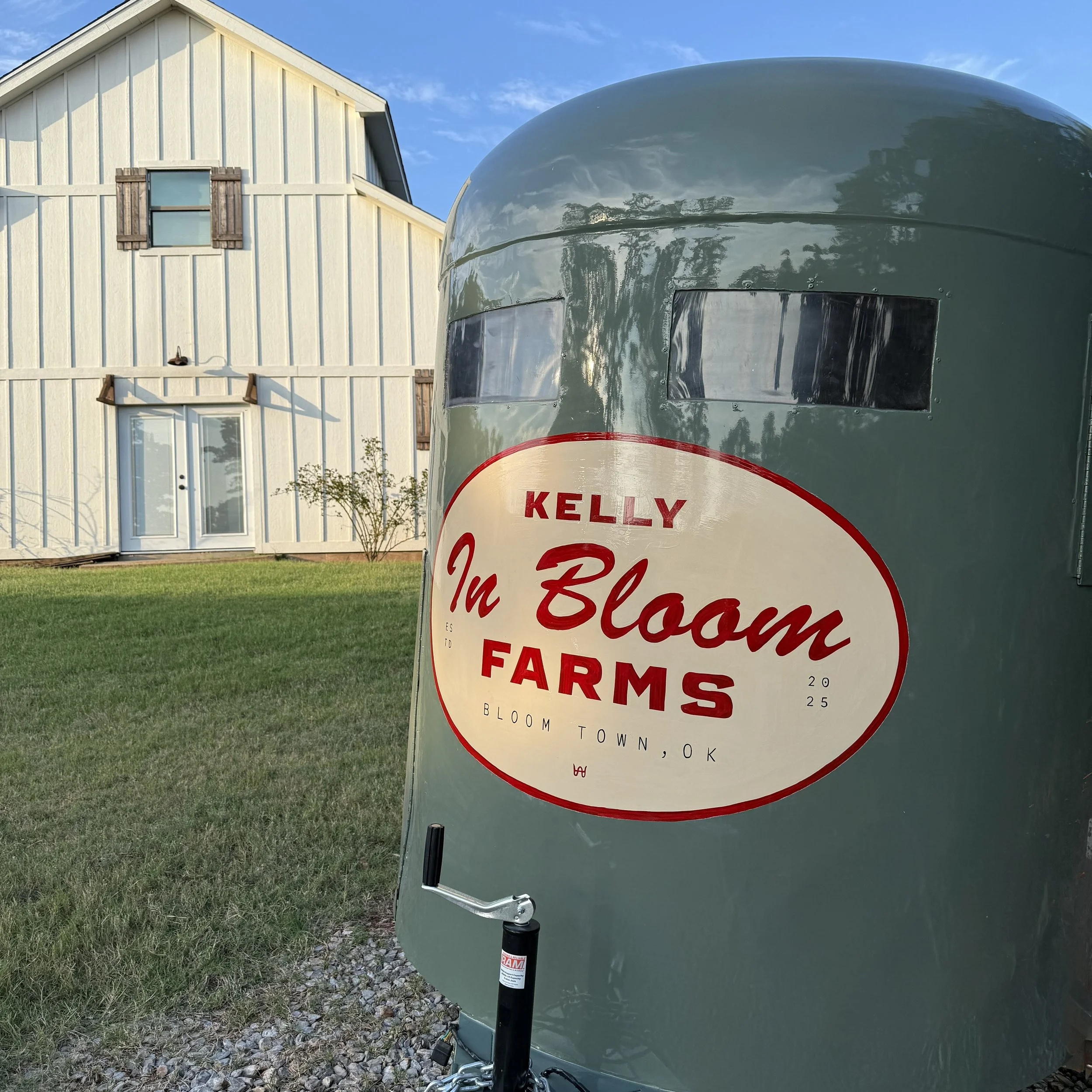 The window sign for The Bend Mercantile featuring a yellow flower and gold decorative border, with a reflection of the street including cars and buildings.